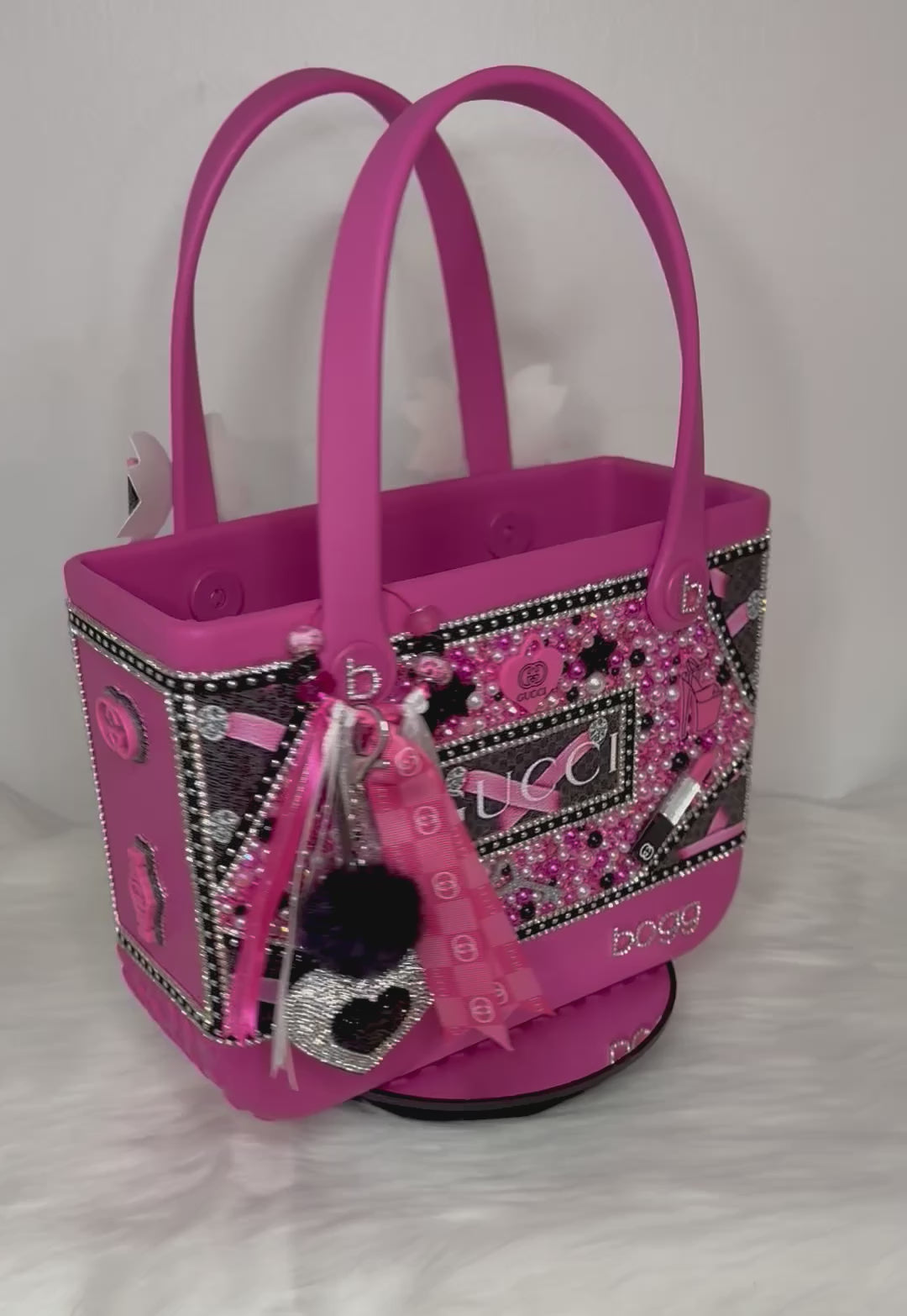 This beautiful custom bag features a GG-inspired design, rich pink tones, and subtle shimmer accents that give it a chic, high-end feel. Built on a durable, water-resistant Bogg-style base, it’s the perfect balance of fashion and function — ideal for brunch dates, vacations, or daily errands in style.